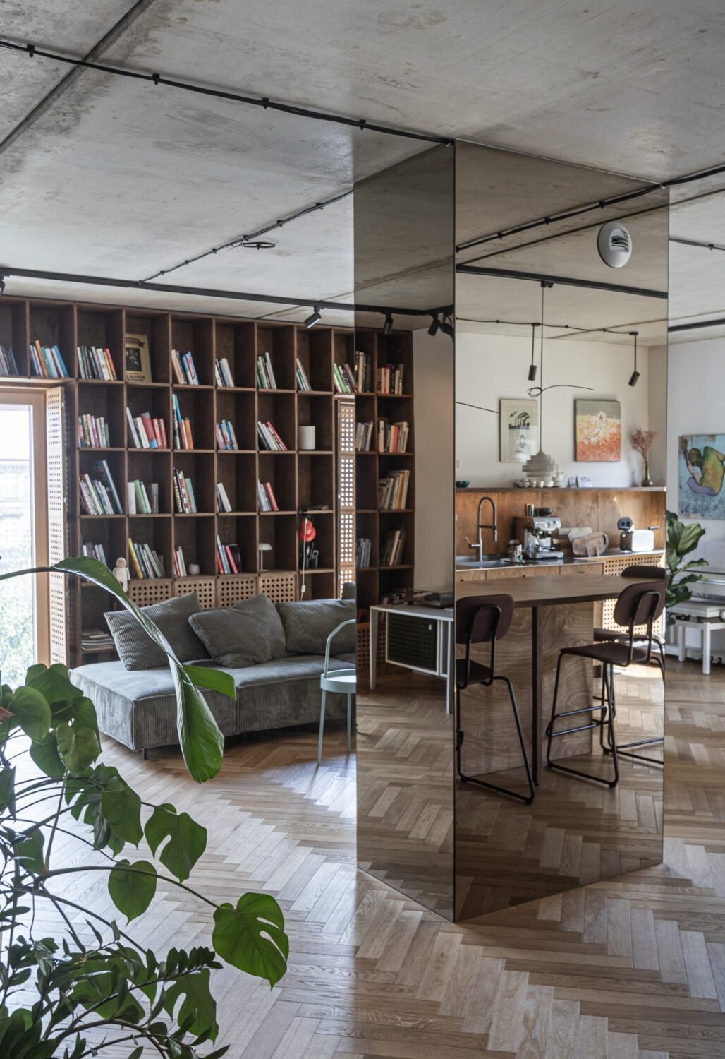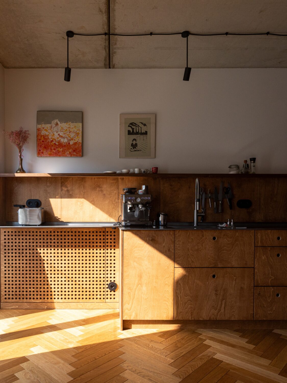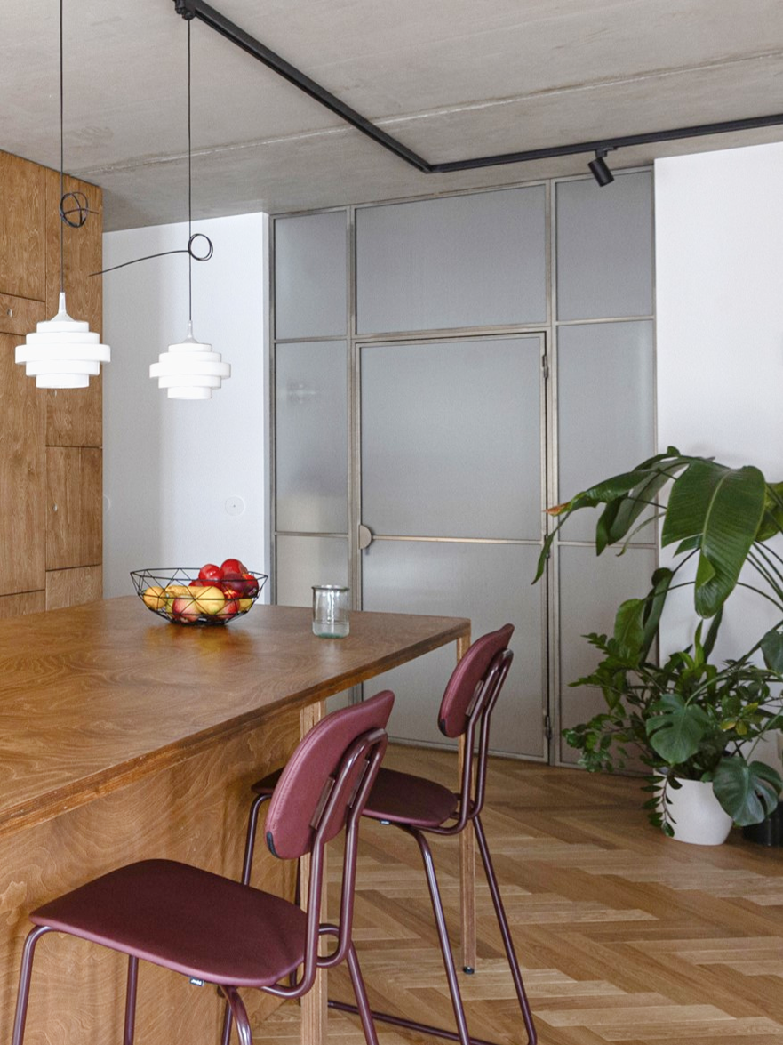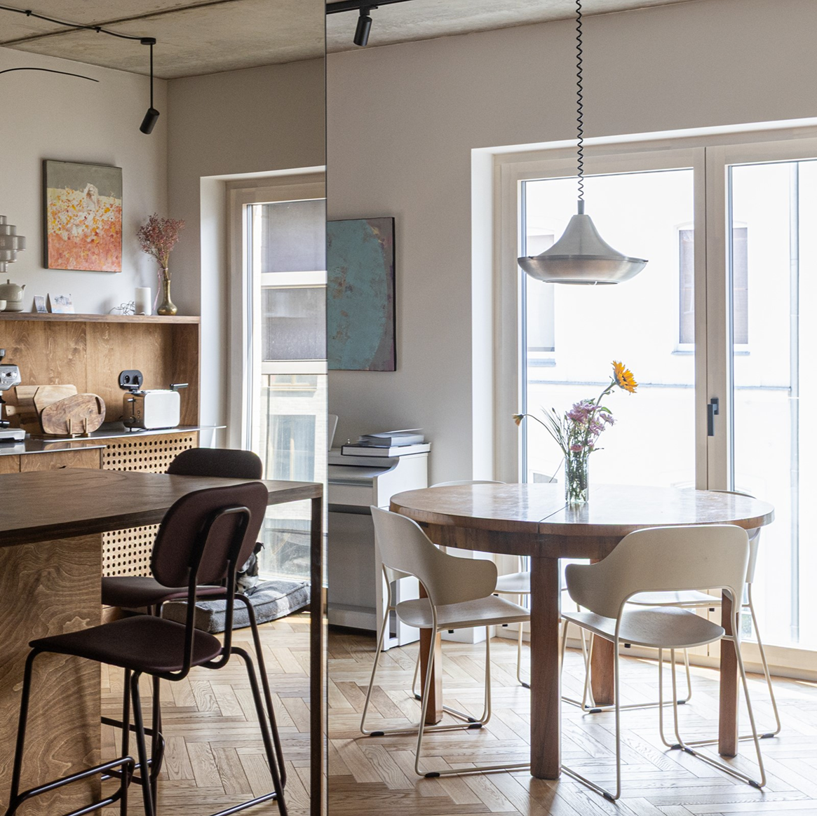 Mieszkanie znajduje się w centrum Wrocławia, w sąsiedztwie placu Kościuszki i budynku Renoma, co nadaje wnętrzu modernistyczny, miejski charakter. Projekt nawiązuje do estetyki lat 60., przekształcając historyczne inspiracje we współczesny język architektury. Opiera się głównie na intuicyjnym podejściu do projektowania przestrzeni mieszkalnej i jej roli – odpowiedzi na potrzeby użytkowników. Projektantom zależało na doborze otulających, naturalnych materiałów. Dominują drewno i sklejka w ciepłych odcieniach brązu, uzupełnione stalą, szkłem oraz betonem w surowej formie. Każdy detal wnętrza został zaprojektowany i wykonany z sercem i zamiłowaniem a starannie opracowane scenariusze oświetleniowe wydobywają bogactwo i ciepło tekstur.