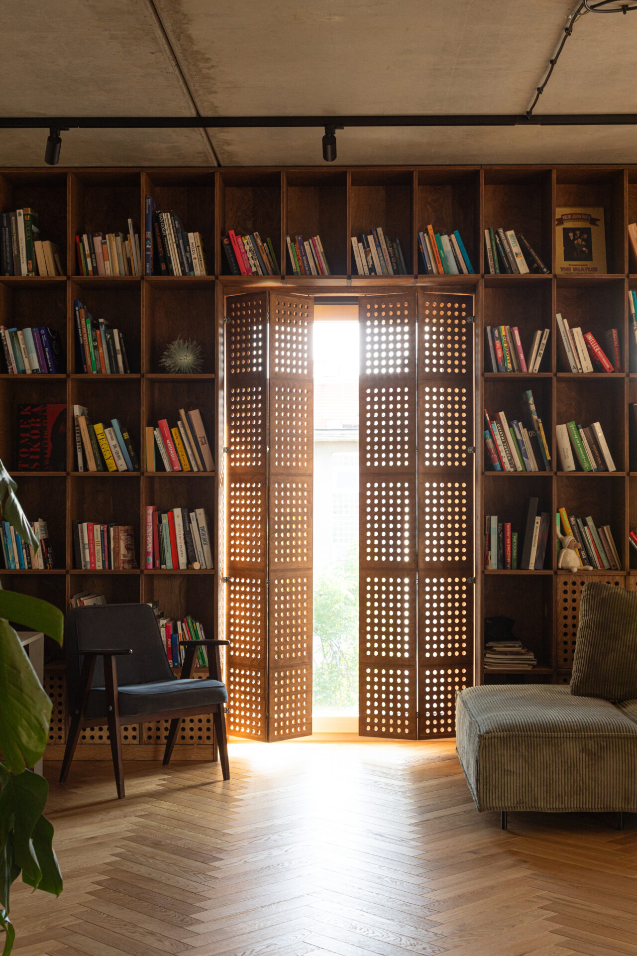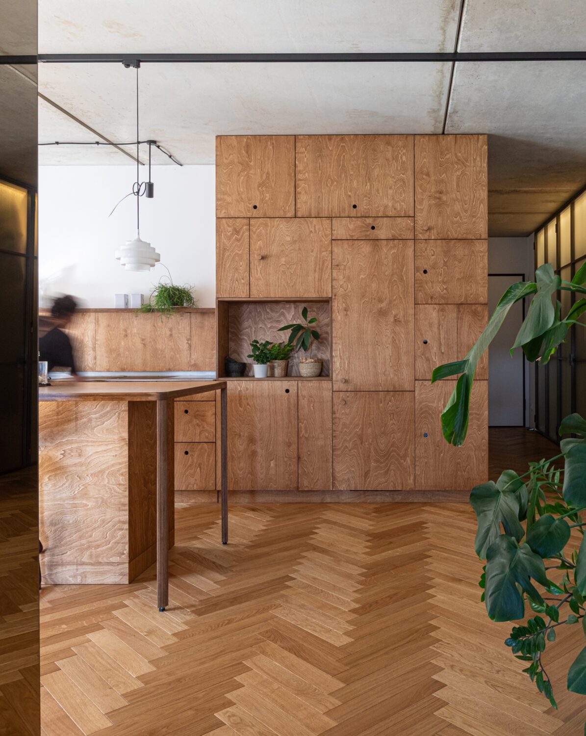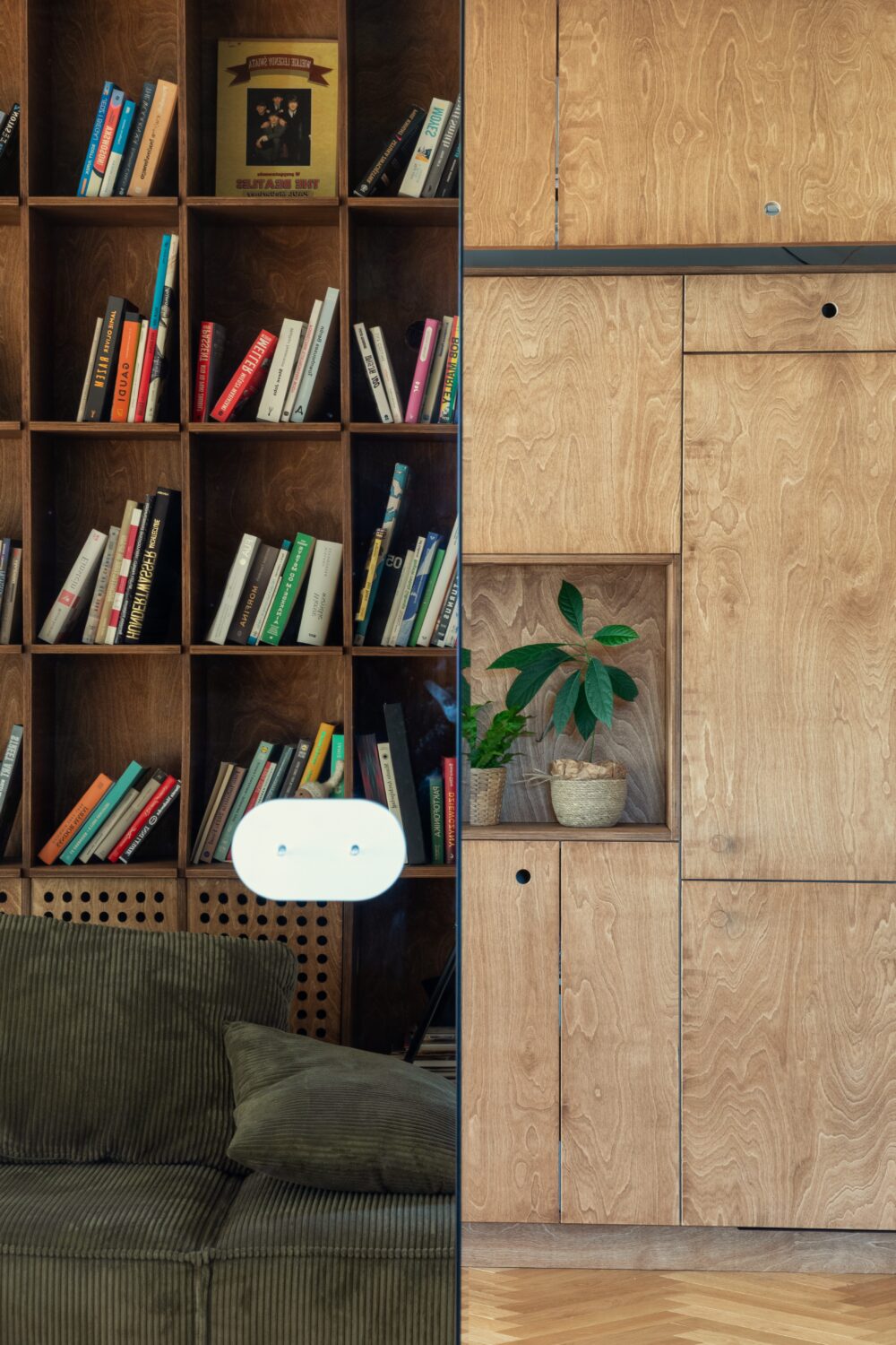 Mieszkanie znajduje się w centrum Wrocławia, w sąsiedztwie placu Kościuszki i budynku Renoma, co nadaje wnętrzu modernistyczny, miejski charakter. Projekt nawiązuje do estetyki lat 60., przekształcając historyczne inspiracje we współczesny język architektury. Opiera się głównie na intuicyjnym podejściu do projektowania przestrzeni mieszkalnej i jej roli – odpowiedzi na potrzeby użytkowników. Projektantom zależało na doborze otulających, naturalnych materiałów. Dominują drewno i sklejka w ciepłych odcieniach brązu, uzupełnione stalą, szkłem oraz betonem w surowej formie. Każdy detal wnętrza został zaprojektowany i wykonany z sercem i zamiłowaniem a starannie opracowane scenariusze oświetleniowe wydobywają bogactwo i ciepło tekstur.