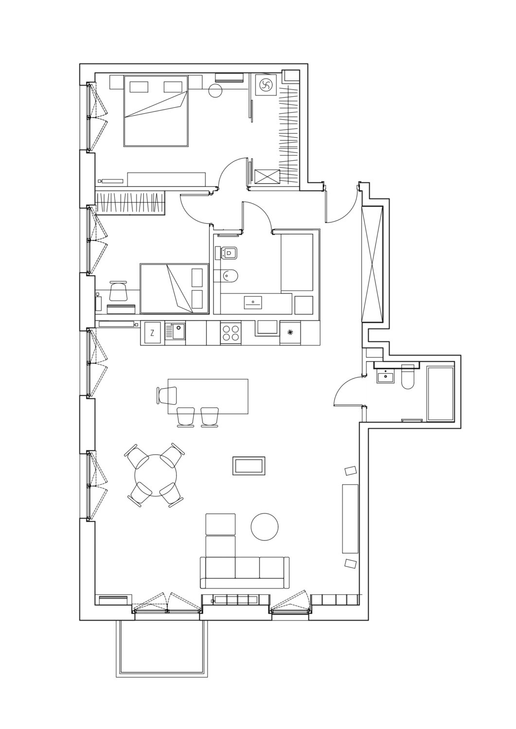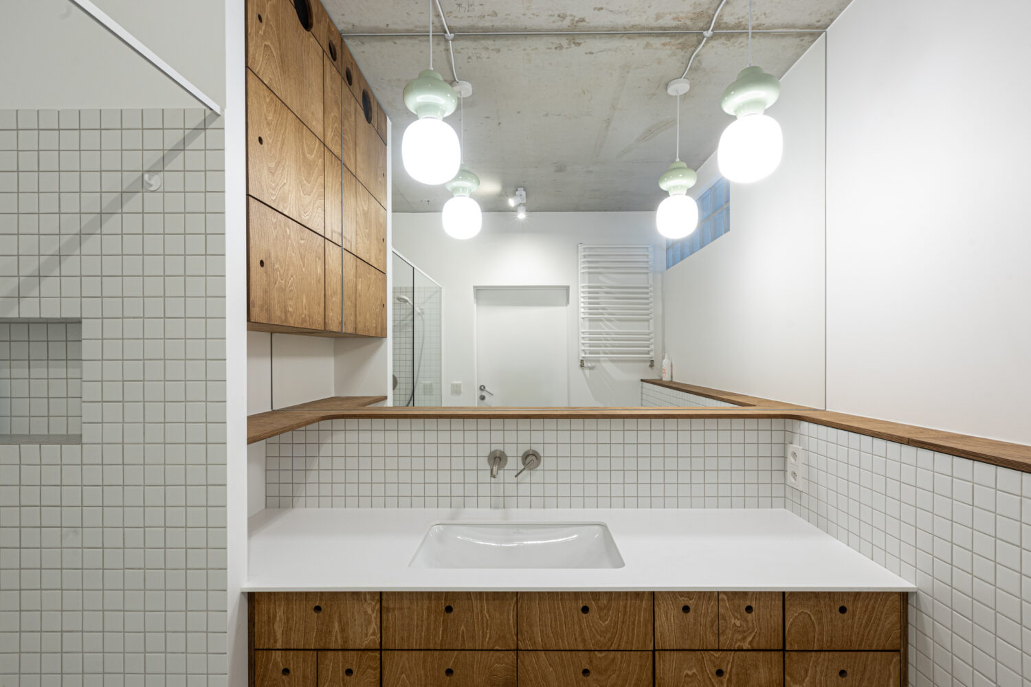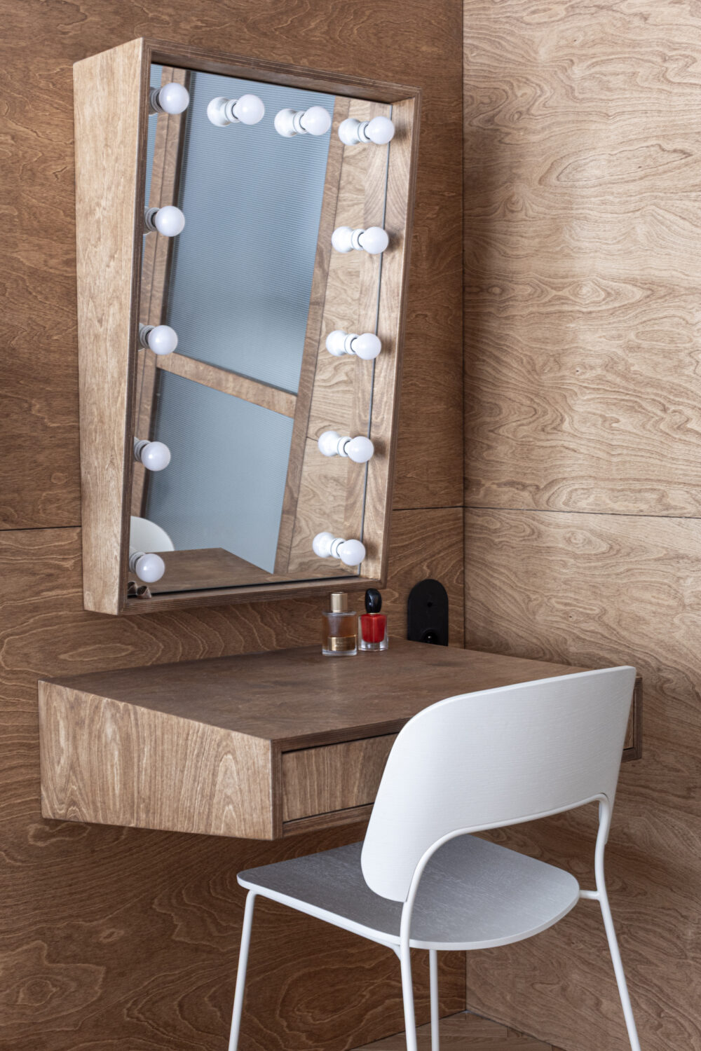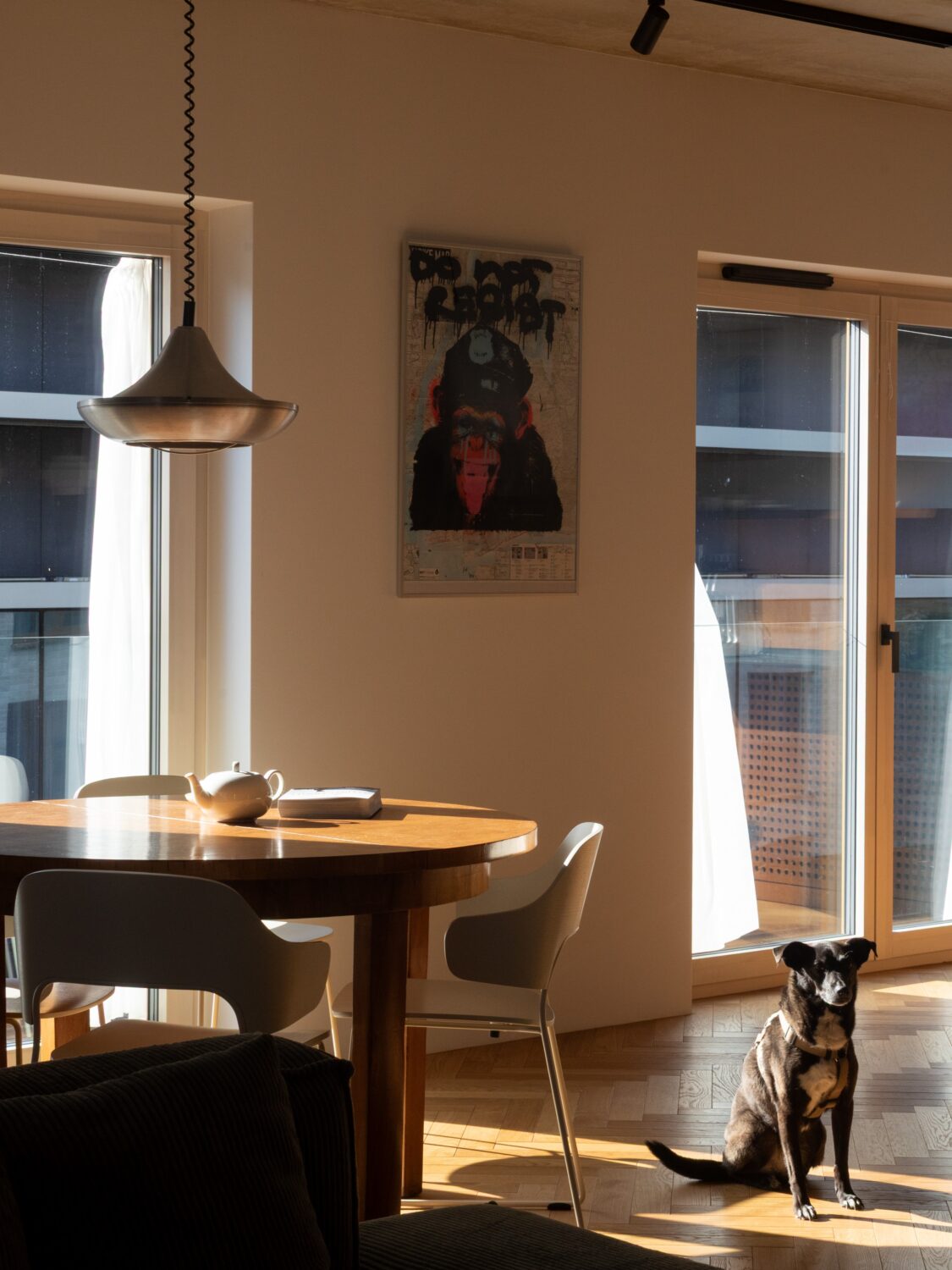 Mieszkanie znajduje się w centrum Wrocławia, w sąsiedztwie placu Kościuszki i budynku Renoma, co nadaje wnętrzu modernistyczny, miejski charakter. Projekt nawiązuje do estetyki lat 60., przekształcając historyczne inspiracje we współczesny język architektury. Opiera się głównie na intuicyjnym podejściu do projektowania przestrzeni mieszkalnej i jej roli – odpowiedzi na potrzeby użytkowników. Projektantom zależało na doborze otulających, naturalnych materiałów. Dominują drewno i sklejka w ciepłych odcieniach brązu, uzupełnione stalą, szkłem oraz betonem w surowej formie. Każdy detal wnętrza został zaprojektowany i wykonany z sercem i zamiłowaniem a starannie opracowane scenariusze oświetleniowe wydobywają bogactwo i ciepło tekstur.