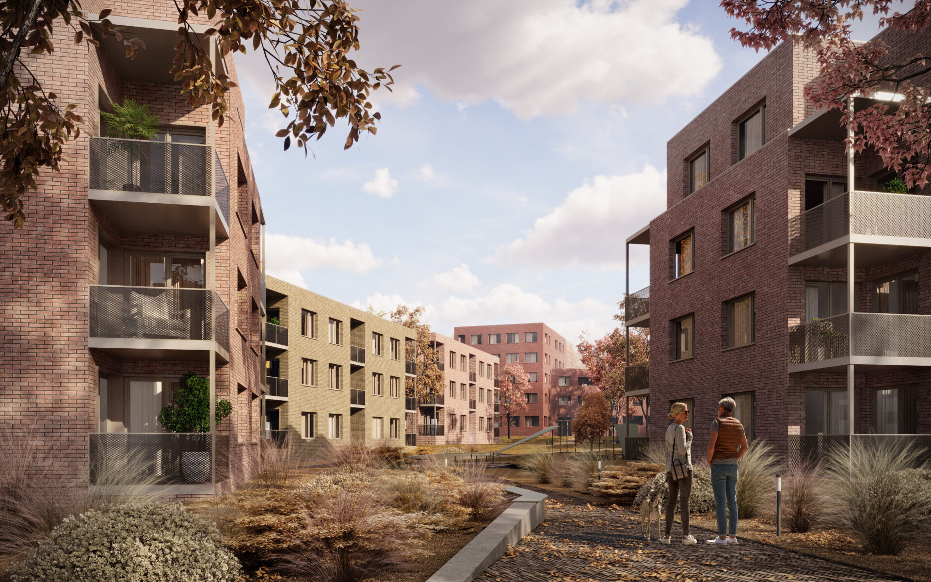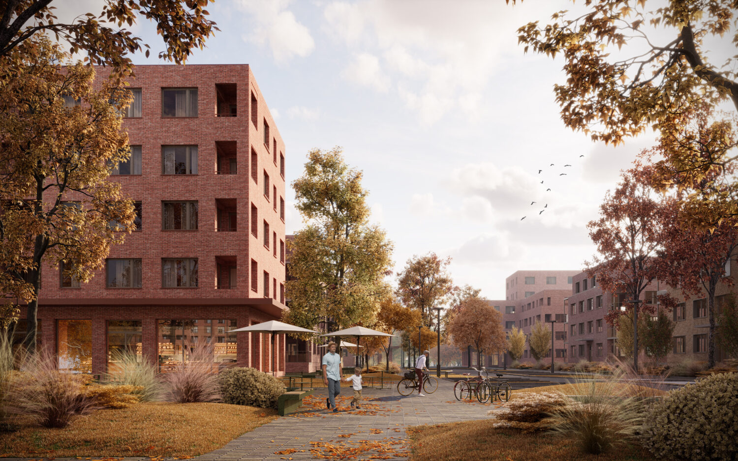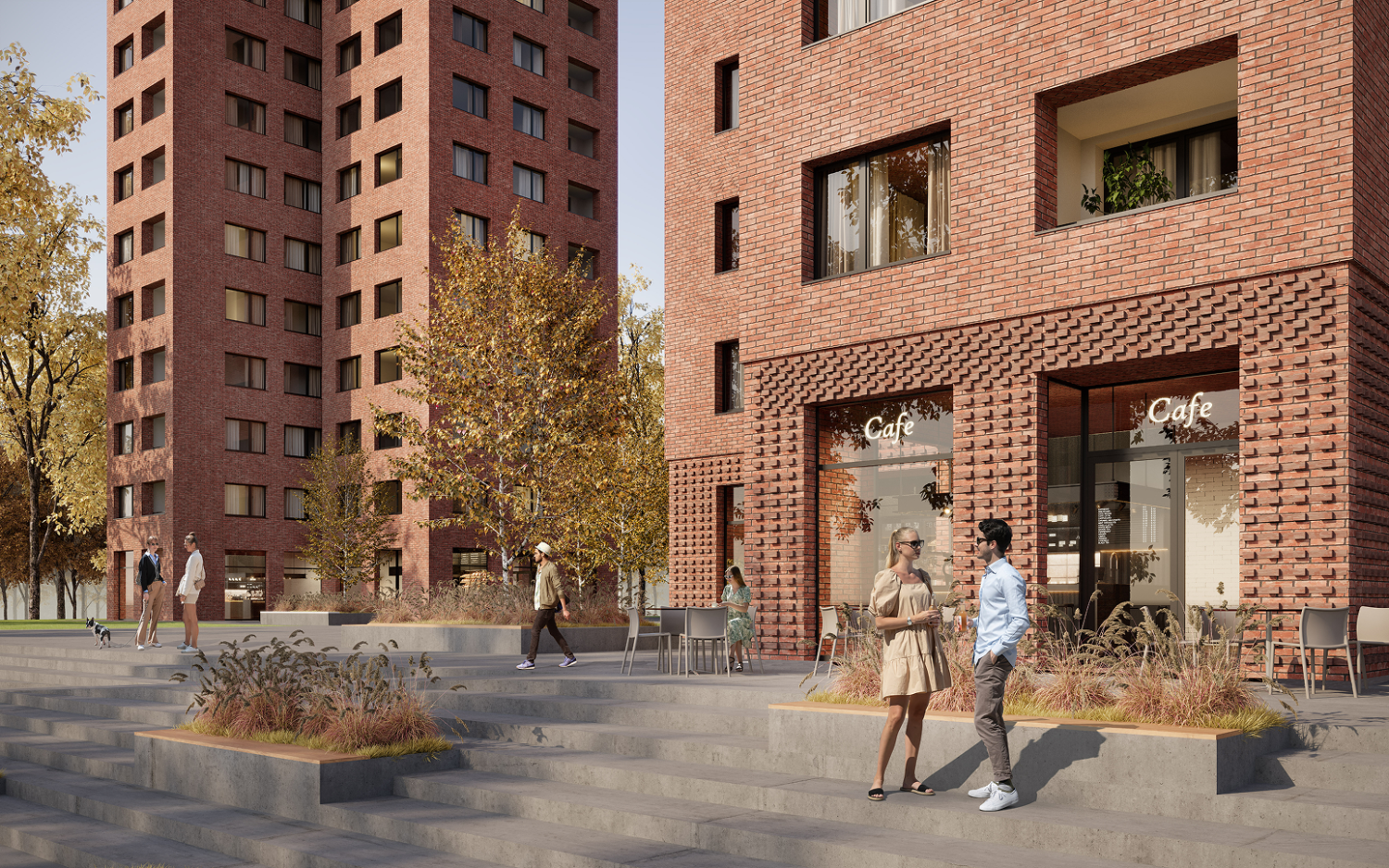 Duże odległości między budynkami zapewniają komfort użytkowania przestrzeni, umożliwiają kształtowanie placów i wnętrz kwartałów oraz dobre nasłonecznienie mieszkań. Lokalnie podwyższone budynki akcentują węzły kompozycyjne, a wyraźne „bramy” prowadzą w głąb osiedla.