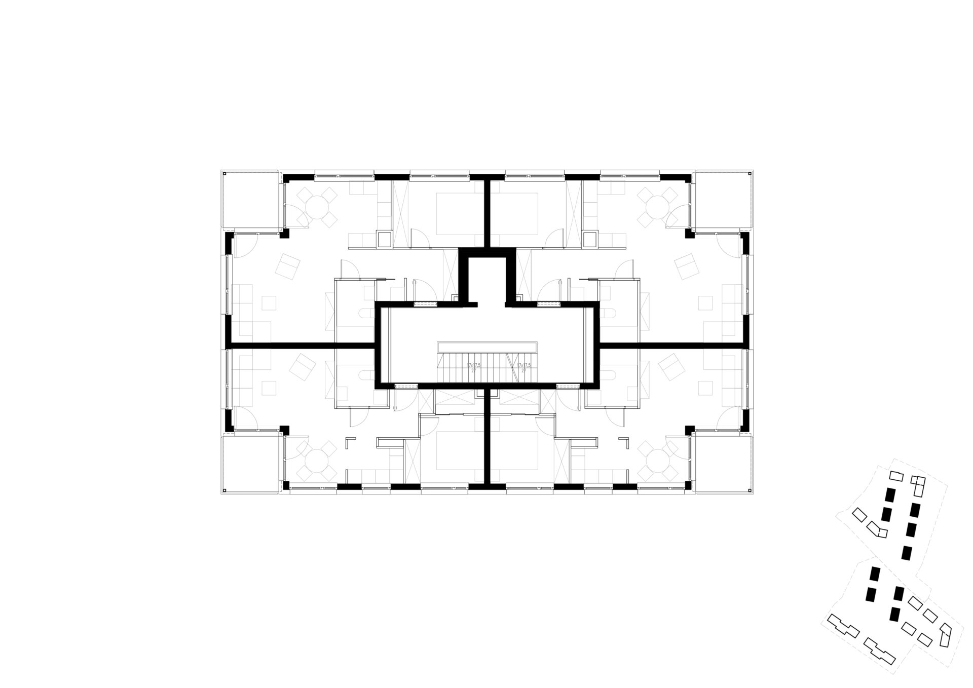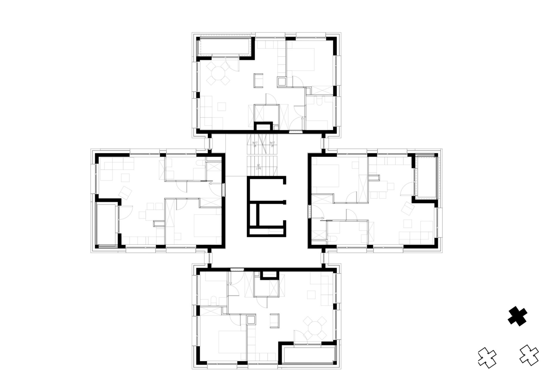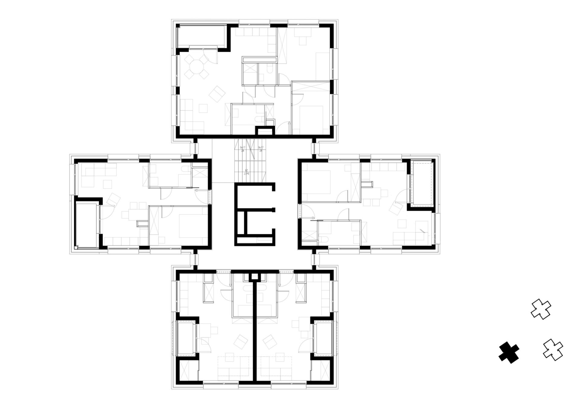 Duże odległości między budynkami zapewniają komfort użytkowania przestrzeni, umożliwiają kształtowanie placów i wnętrz kwartałów oraz dobre nasłonecznienie mieszkań. Lokalnie podwyższone budynki akcentują węzły kompozycyjne, a wyraźne „bramy” prowadzą w głąb osiedla.